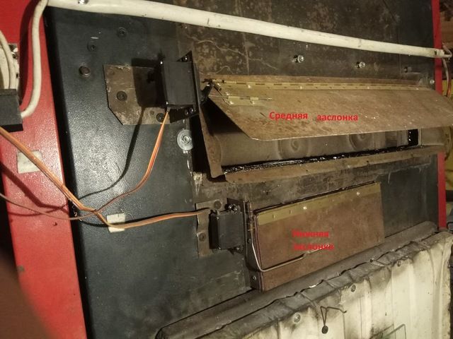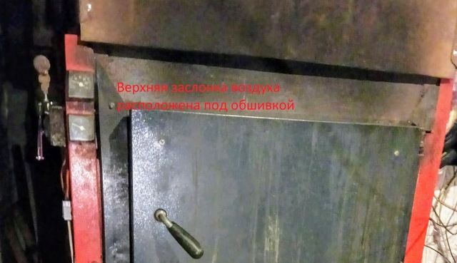 Моят котел, както повечето пиролизни котли, е роден с един амортисьор (сега е със средна височина, той е и основният). Клапата е разположена отпред на котела, под долната врата за зареждане с гориво. Въздухът през него се подава към горивото, разположено над горелката и покрива около 100 cm3 дърва за огрев.Това е количеството гориво, което участва в основния процес на горене. Същият обем гориво образува въглищен слой, върху който се запалват пиролизните газове. Горната клапа е разположена под кожата, над долната врата за зареждане с гориво. Появи се по-късно, неговата задача е да образува допълнителен обем пиролизни газове, след като горивото, разположено в зоната на покритие на средния амортисьор, премине от първия към третия етап на пиролиза и вече не отделя достатъчно количество горими газове спрямо подавания през него (среден амортисьор) въздушен обем.
