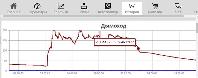 Моят блок за управление на котела е свързан с облачна услуга, това ми позволява да наблюдавам дистанционно състоянието на системата и, ако е необходимо, също и дистанционно, да правя корекции в работата на котела и отоплителната система като цяло. Защо да поискате дистанционно управление на отоплителната система и по-специално дистанционно управление на работата на TTK? Вярвам, че само много смел човек може да си позволи да остави работещ котел само под надзора на контролен блок, който струва малко повече от 100 долара. Получих увереност в необходимостта от дистанционно управление, тъй като натрупах личния си осемгодишен опит в управлението на TTK. Тази услуга предоставя изключително полезна възможност за графично представяне на данни от температурни сензори, разположени в ключови точки на CO, което от своя страна не само дава представа за текущото статично състояние на CO, но и за динамиката на развитието на процесите, протичащи там. Така че, по-специално, данните, получени от раздела "Графики", дават представа за текущото състояние на CO, за коректността на работата на отделните му компоненти в съответствие с програмата, посочена от CU, и за разлика от тях на данните, получени от монитора на CU, дайте представа за динамиката на тези данни, скоростта на промяна и посоката на движение (увеличаване или намаляване), което е особено важно по време на прагови (критични) температури. Независимо дали TTC е бил попълнен със студена вода от TA или не, можем дистанционно, незабавно да проследим „Вход на котела“ на графиката и дали този грим е имал очаквания резултат от предпазване на котела от прегряване, можем да го проследим графиката "Изход на котел". Ако очакваното понижаване на температурата на водата на входа / изхода на котела не е настъпило, тогава по някаква причина клапанът на веригата TA не се отваря и собственикът на котела трябва да предприеме адекватни мерки за защита на TTK. Също така данните, получени от тези графики, ви позволяват бързо да забележите и отстраните грешките на оператора на котела, допуснати при управлението на котела.По-специално, благодарение на графика "Комин", навреме забелязах, че съм забравил да върна в работно положение разпределителната клапа, която насочва продуктите от изгарянето на горивото, заобикаляйки топлообменника на котела в комина (обикновено той се прехвърля към този положение при добавяне на гориво за намаляване на дима в помещението), което от своя страна доведе до превишаване на температурата в комина над 250 ° C.
