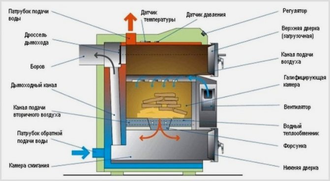 Горивната камера (дожиг) е разположена под камерата за зареждане с гориво, за да локализира определен обем гориво, участващо в процеса на горене. Тоест в пиролизния котел изгарят само онези дърва за огрев, които са в зоната на покритие на въздушните клапи (това е под средната врата и малко на височината на средната врата), останалото гориво е просто резерв, който при изгаряне потъва в зоната на горене. Ако пиролизната камера е поставена отгоре и горивото се запали отдолу, тогава пламъкът, издигащ се отдолу нагоре през дървото, ще пиролизира цялото гориво наведнъж и вместо изгаряне ще получим много дим и като резултат, смолисти вещества на топлообменника.
