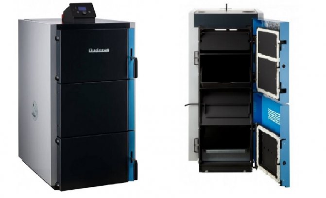 - Vitoligno 100-S от VIESSMANN - премиум клас (Германия). Тези агрегати имат мощност от 25 до 80 kW, нивото на ефективност достига 88%. Линията на такива модели има работно налягане не повече от 3 Bar. Температурният индикатор на захранващия тръбопровод е 95 градуса, а връщащата тръба е 55 градуса. Могат да се използват трупи с дължина до 50 см. Vitoligno 100-S има автоматична система за управление, която се състои от контролер и набор от сензори. В канала на комина има вентилатор, който осигурява сцепление, тъй като служи като димоотвод. Контролерът регулира работата не само на вентилатора, но също така и на циркулационни и мрежови помпи, както и на трипътен тръбен клапан на котела.