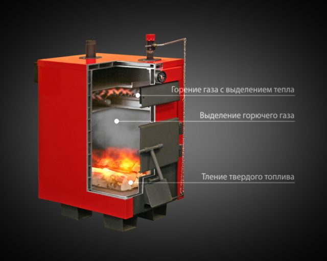 Дизайнът на пиролизния котел има двукамерно нагревателно устройство, където в горната част се загрява до 200-800 градуса, което допринася за настъпването на екзотермична реакция на твърдо гориво. Няма кислород, поради което материалът бавно тлее. Разлагайки се на CO и CO2, сместа отива в долната част на котела, където температурата на горене вече се поддържа около 1100-1200 градуса. Двете камери са свързани с решетки. Резултатът е отделянето на голямо количество топлина (пиролизен газ), предназначено за отопление на къщата. Останалата част от горивото, което не изгаря, се нарича кокс или въглен.