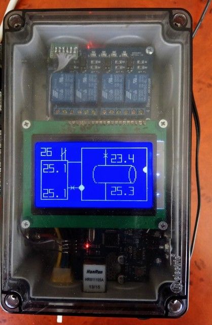 В крайна сметка, с участието на любезни хора, BU придоби формата, която има днес, както и функционалността, която е толкова необходима за мен. Екранът показва графично текущото състояние на основните CO единици, които трябва да бъдат наблюдавани. В същото време екранът не е претоварен с информация и е лесен за четене. Допълнителна информация за това какво оборудване в момента се използва от контролния блок може да бъде получена от светодиодите на релейния блок.
