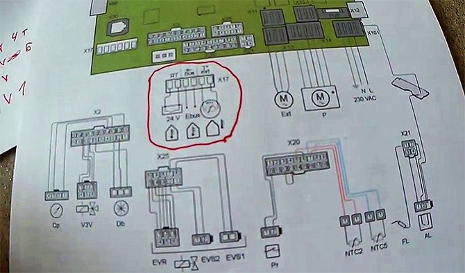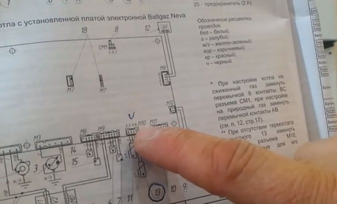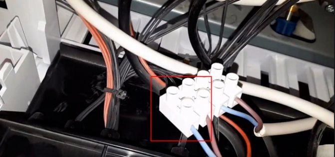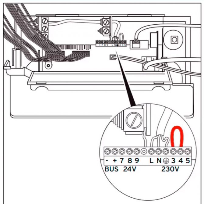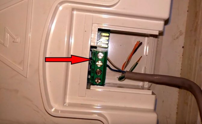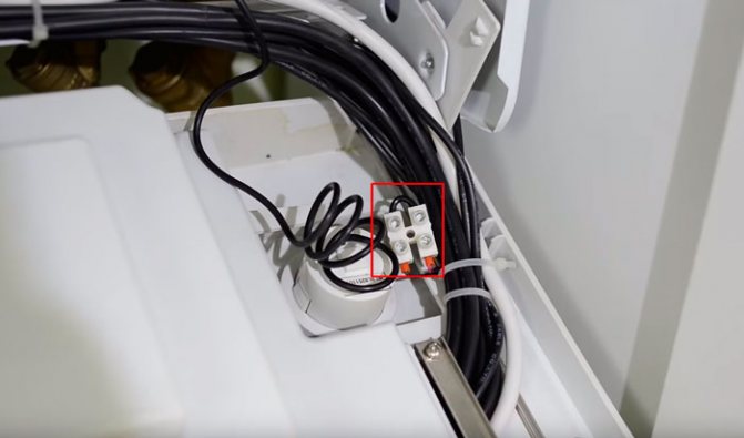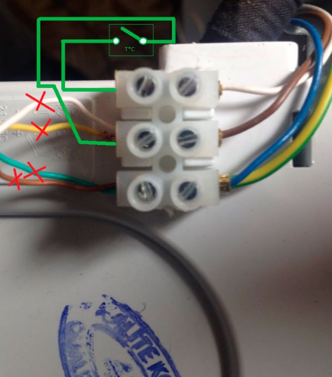 Някои инсталатори, по време на инсталацията, свързват кабел тук и го извеждат, така че потребителят да не се изкачи на дъската в бъдеще и да не обърка нещо там. Тъй като термостатът все още не е инсталиран, краищата на кабелите са късо съединени.