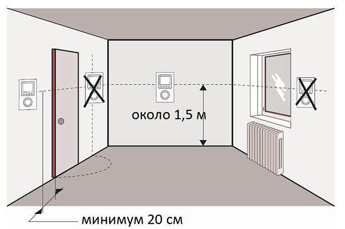 Такива термостати трябва да се поставят на височина 1,2-1,5 м от нивото на пода и доколкото е възможно от източници на отопление, включително защитени от пряка слънчева светлина.