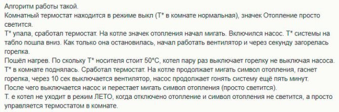 При задействане горелката първо се изключва, след това след определен интервал (време на работа на помпата) и циркулационната помпа. Въпреки че при различните модели алгоритъмът на работа на помпата може да се различава.