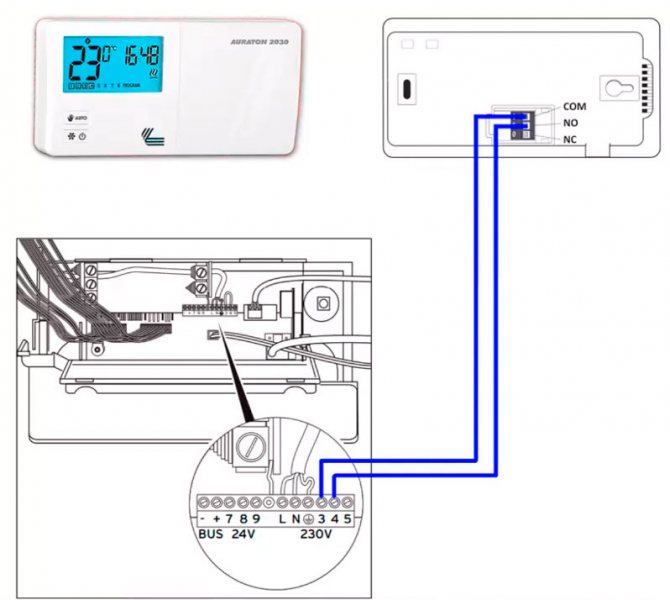 За това обаче трябва да „отделите“ напрежението 220V. В повечето термостати за подово отопление той идва към клемите за захранване и след това се отстранява от клемите, които отиват към отоплителния кабел. И както бе споменато по-горе, при работа с газов котел се използват „сухи контакти“, през които се предават импулси с ниско напрежение.
