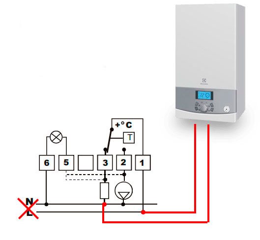 От клемите на термостата, вместо кабела за подово отопление, приложете напрежение 220V към бобината на релето (контактора) и чрез нейните нормално отворени контакти (1-2 или 3-4) свържете проводниците към газовия котел.