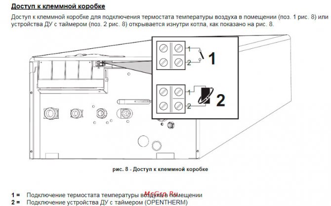 Схемата на свързване на термостата директно към отоплителното оборудване винаги е посочена в техническата документация, приложена към газовия котел. Съвременното оборудване от всеки производител е оборудвано с точки за свързване на устройство за контрол на температурата.