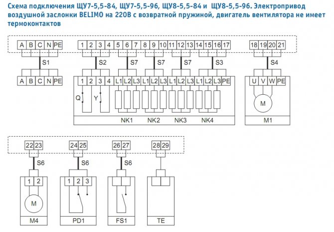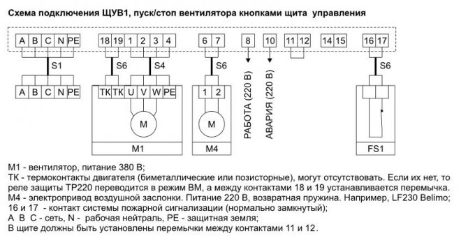 Свързването на шкафовете за управление се извършва съгласно стандартната схема и се регулира от GOST R51321-1. Шкафове, щандове и панели се монтират в коридори, панелни помещения или помощни помещения. При наличие на технически условия блоковете за управление на вентилацията и пожара са разположени в един шкаф, който се поставя в контролната зала. Това ще осигури бърз достъп до аварийните и обслужващи контролни панели за вентилация и ще позволи по-бърза реакция на системни проблеми.