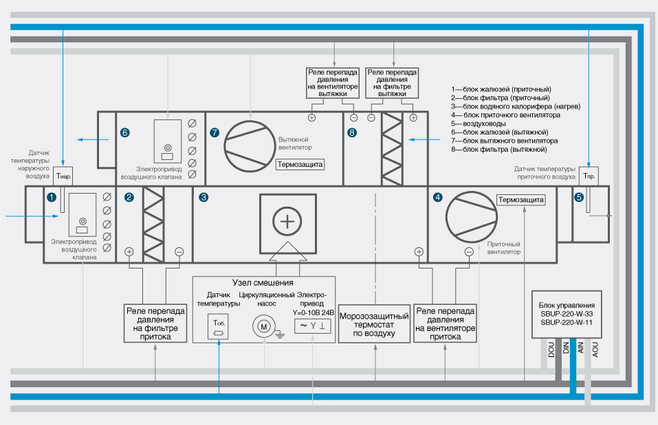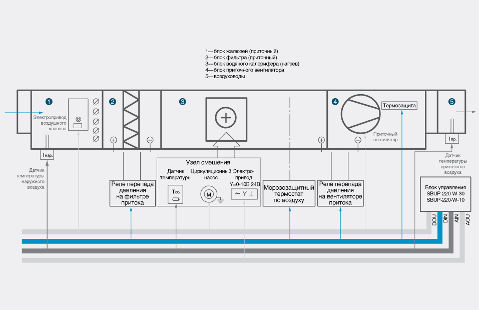 Шкафът за управление на захранващата и изпускателната вентилация работи в режим на готовност или през лятото. В летен режим температурата на въздуха не се контролира. Когато температурата на входящия въздух е ниска, автоматиката на шкафа превключва управлението на захранващата вентилация в режим на защита.