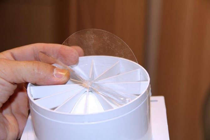Ние правим клапи за клапана от дебел пластмасов филм. На първо място, трябва да изрежете филма до размера на основата и едва след това да го залепите към основата на клапана. Моля, имайте предвид, че клапите трябва да покриват изцяло вентилационните отвори.