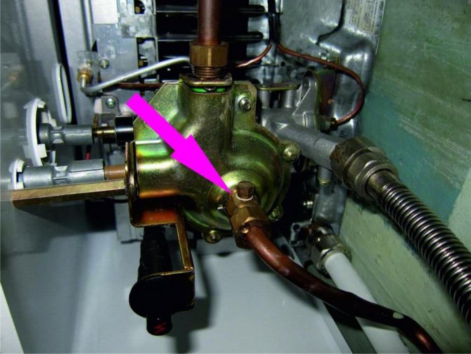 - Регулаторът на налягането на водата е настроен на минимално ниво. В системата се създава малко налягане за активиране на мембраната и отваряне на газовия клапан. Задайте копчето на максималната стойност.