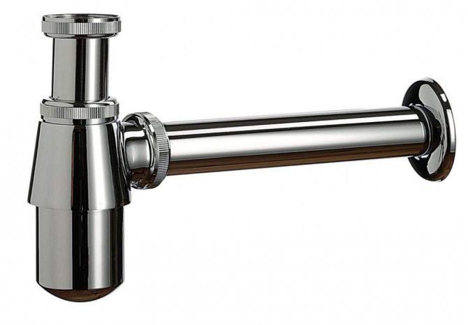 - Сифони за бутилки. В момента този конкретен вид е много популярен. Дизайнът има специална колба, която наподобява бутилка по форма - оттук и името на модела. Те се инсталират на почти всички видове водопроводни инсталации (мивки, душове, перални и съдомиялни машини и др.). Те са компактни и привлекателни на външен вид, особено изработени от различни метали. Друга характеристика: ако предмет, който трябва да бъде изваден (бижута или друго малко нещо) е попаднал в канализацията, това може да се направи без затруднения.