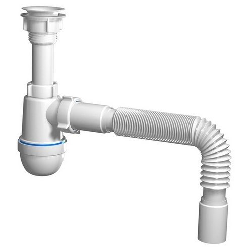 Това е най-простата система. Броят на частите в него е минимален. Основният елемент на устройството е гофрирана тръба, в която е създадено водно уплътнение. Той също така играе ролята на дренажни тръби. Процесът на монтаж се състои в свързване на единия край на частта към мивката, а другия към канализационния контакт. След това задължително се извършва огъването на необходимата дълбочина и се фиксира с пластмасова скоба. Устройството е готово за употреба.