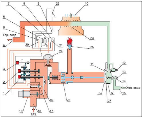 Студената вода от водопровод или кладенец под налягане 2,0 ... 2,5 kg / cm2 от вход 15 постъпва в топлообменника 23. Тук водата се загрява до предварително определена температура и през изход 4 отива в системата за подаване на топла вода на помещенията. Природният газ от магистралата през входа 18 навлиза в клапан 19. Предназначението на клапана 19 е да прекъсне подаването на газ в случай на аварийна повреда в колоната или недостатъчно налягане на газа във входящата магистрала. След преминаване на клапана, газът постъпва в редуктора, който намалява излишното налягане, а след това през клапана 22 - към централната горелка 25. Централната горелка се запалва от пламъка на пилотните горелки 7, 20, 21.
