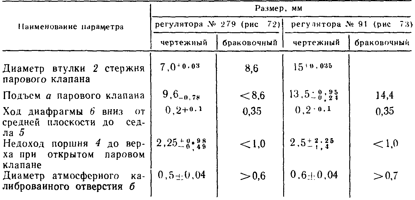 Забележка. При налягане на парата от 6 - 11 kgf / cm2 времето на пълнене на резервоара от 2 до 0,5 kgf / s и 2 е не повече от 90 s Таблица 9. Размери на регулаторите на хода за помпи № 279 и 91