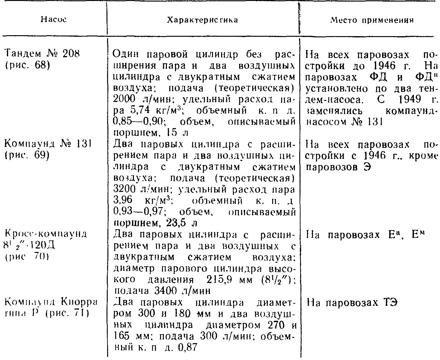 Паровите локомотиви и железопътните търгове са оборудвани с тандемни или комбинирани парно-въздушни помпи (Таблица 1-10) и спирачки Westinghouse. Фиг. 1. Тандемна помпа No 208: 1 - въздушен цилиндър с високо налягане; 2 - въздушен цилиндър с ниско налягане; 3 - автоматична мазнина 1053, 4 - парен цилиндър; 5 - капак за разпределение на пара; 6 - нипел за грес No 202, 7 - изпускателна тръба; 8 - смукателни клапани; 9 - тръба за подаване на пара с диаметър 1 ′