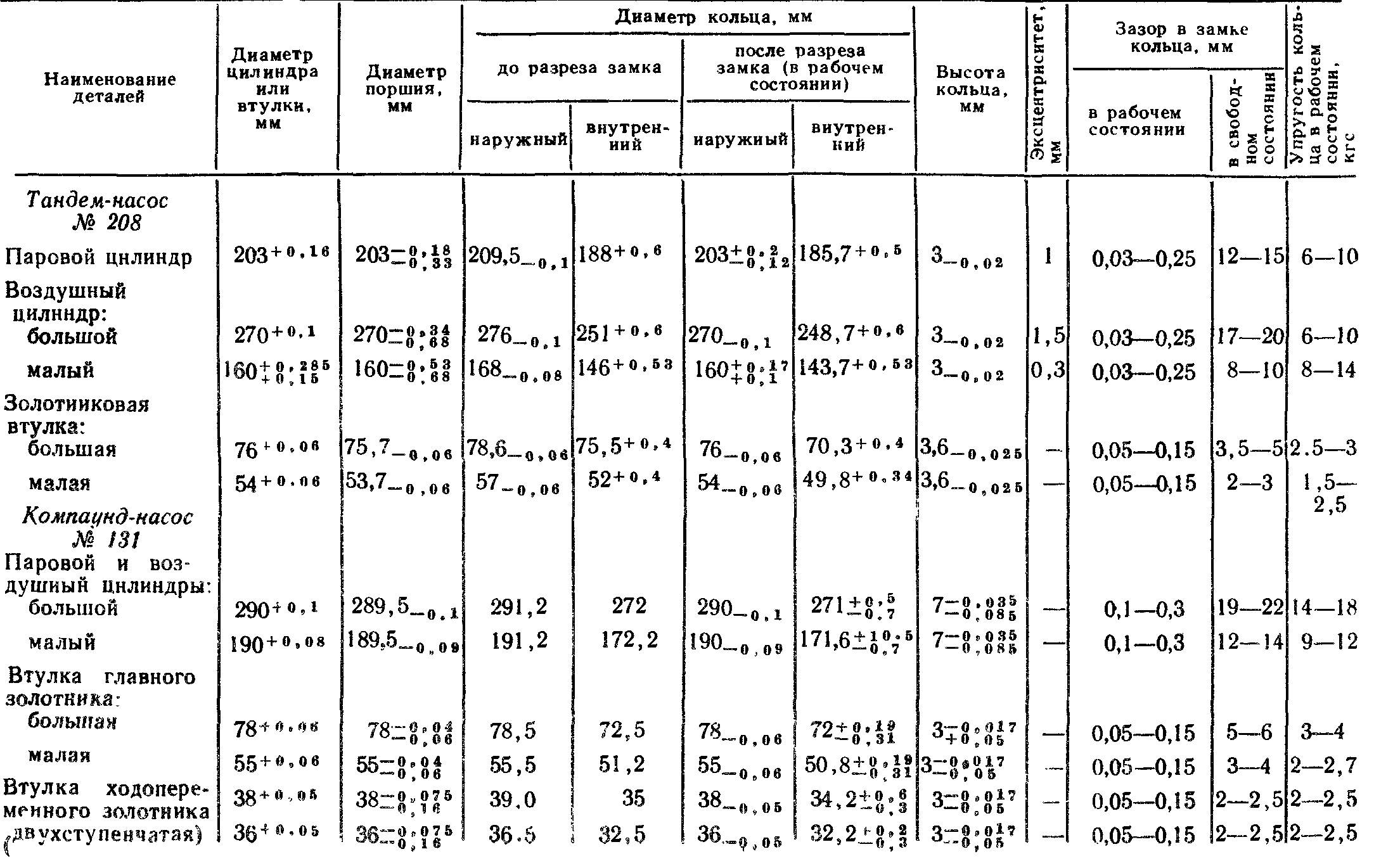 Таблица 4. Размери на цилиндрите, буталата и пръстените на паро-въздушните помпи