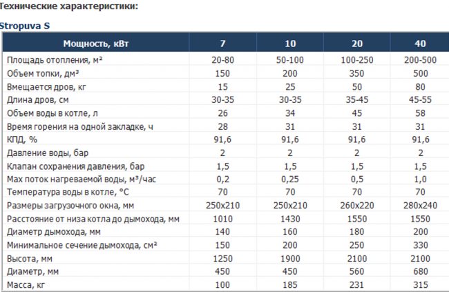 Котелът на дърва Stropuva е оборудван със специален разпределител на въздуха, който ви позволява ефективно да изгаряте дърва, има следните характеристики:
