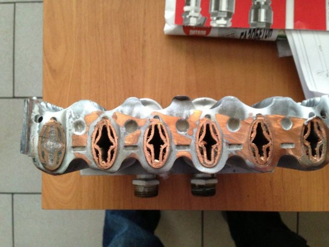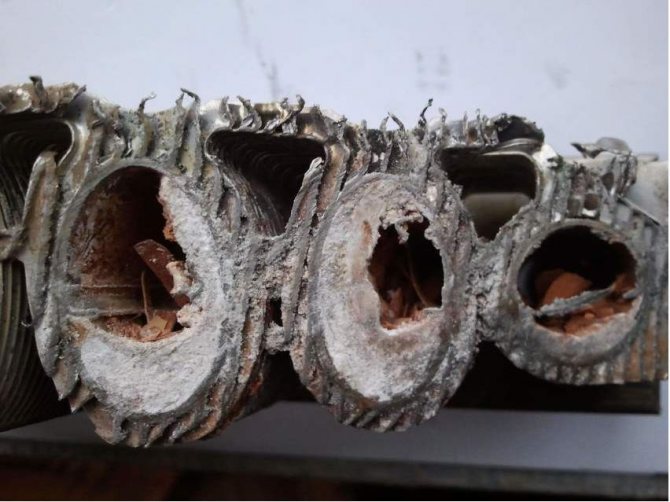 Поради факта, че водата не се филтрира, преди да влезе в нагревателните елементи (прочетете за избора на филтър за отопление в отделен материал), следователно утайката често остава върху вътрешните повърхности на газовия котел. Частите постепенно губят своята функционалност. Проблемите започват с елементите за пренос на топлина. Освен това се образува утайка по стените на радиаторите, тръбите, това намалява пространството, през което трябва да тече вода. Доста просто е да се отървете от котлен камък, просто отворете газовия котел и го почистете със специални средства. В този случай страда само устойчивостта на износване на самото оборудване. За да се избегнат подобни проблеми в бъдеще, достатъчно е да се извършва периодично превантивно почистване.
