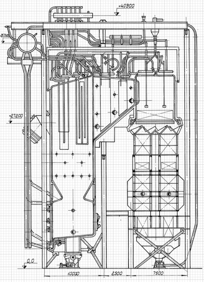 Горната част на горивната камера е затворена с прегревател. Пещ 13 независими вериги, свързани чрез горни и долни колектори от котелни тръби 219 х 25 мм.