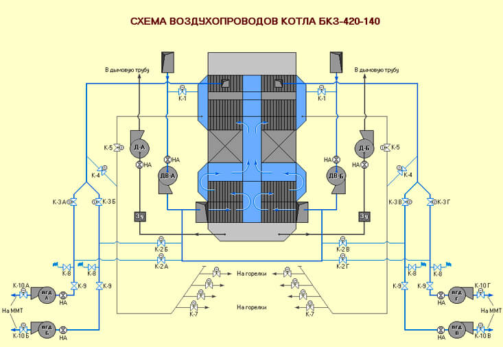 За да се нагрее въздухът до 300 C, е инсталиран регенеративен въздухонагревател RVP-54, преди да бъде подаден в устройството за горелка BKZ. Преди това на такива единици бяха инсталирани тръбни конструкции, които имаха големи размери и ниска ефективност.