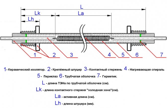 Удобно е да разгледате устройството на примера на тръбен модел. Електрическият нагревател е керамична или метална тръба, изпълнена с топлопроводник със спирала, разположена вътре. На мястото, където тръбата е фиксирана към фланеца, има изолационни втулки, които правят невъзможно проводящата спирала да се свърже с тялото на нагревателния елемент.