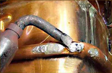 - разтрийте пукнатината или дупката с спойка и след като се охлади, добавете още калай (слоят трябва да е 1-2 мм).