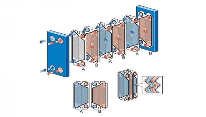 Всеки от слоевете е канал, изолиран в топлообменника. Плочите имат релеф, от който са оформени тези проходи. Дебелината на преградите обикновено е 1 мм. Каналите имат ъгли и колкото по-остри са те, толкова по-висока е скоростта на течността и обратно. Моделът на движение на водата може да бъде еднопосочен и многопосочен - с промяна в посоката. Във втория случай се постига по-висока ефективност.