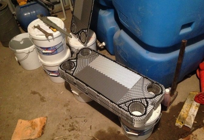 Преди всичко изплакнете топлообменника със студена чешмяна вода. След това изсипете лимонена киселина в устройството и поставете в кофа с вода. След това - извадете топлообменника и го напълнете с вода, за да проверите проходимостта.