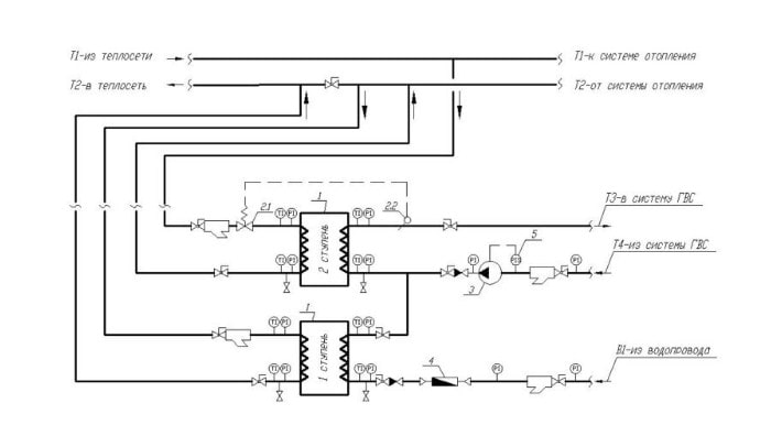 Когато се използва двустепенна схема на свързване на топлообменника, отоплението на водата за подаване на топла вода се извършва или в две независими устройства, или в моноблокова инсталация. Независимо от конфигурацията на мрежата, инсталационната схема става много по-сложна, но ефективността на системата се увеличава значително и разходът на охлаждаща течност намалява (до 40%).