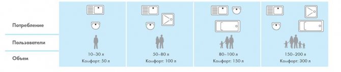 Като цяло можете да използвате следното грубо изчисление. За един човек, който използва душ и кухненска мивка за миене на съдове, ще е достатъчен бойлер с 30 литров резервоар. Този обем на резервоара е подходящ за инсталиране на котел за всеки случай. Семейство от 2 души, които се къпят всяка сутрин, няма да е достатъчно. Тук инсталирането на бойлер за съхранение на вода от 50 литра ще бъде оптимално. За 3 души резервоар от 80 литра ще бъде достатъчен, а за 4-5 жители при същите условия на използване на вода ще е необходим котел с водоснабдяване от 100-150 литра. Особено внимание трябва да се обърне на вземането на вани, тъй като дори една вана може да консумира целия обем гореща вода в 100 литров резервоар.