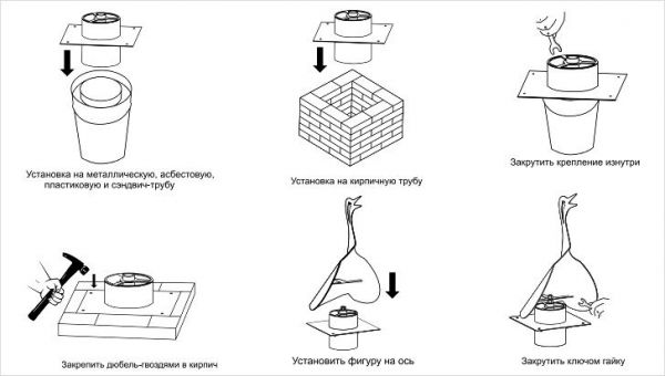 Има няколко вида продукти, които се монтират на тръбата. Те се различават по своята структура и принцип на действие. Основните могат да бъдат разграничени: чадър, ветропоказател, капачка, глава и комин. Вече разбрахме какво е чадър, сега нека дефинираме останалите понятия.