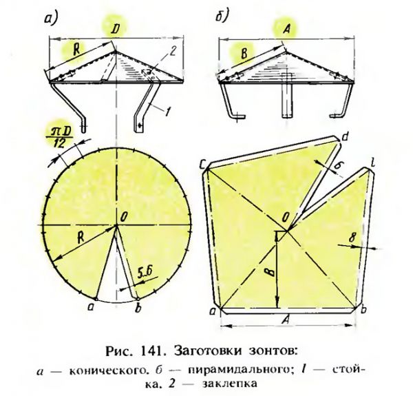 Краката за гъбичките и скобата около тръбата са направени от стоманени ленти, направени чрез огъване на тънък лист 2-3 пъти. Тези части също са прикрепени към чадъра с нитове, което е ясно демонстрирано от майстора във видеото: