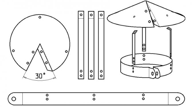 Скици могат да се вземат като основа за направата на чадър. Конкретните размери на частите ще зависят от диаметъра на вентилационната тръба. Дължината на скобата от завой до завой е равна на обиколката на тръбата, намалена с 5 мм. Диаметърът на капачката е равен на два диаметъра на тръбата