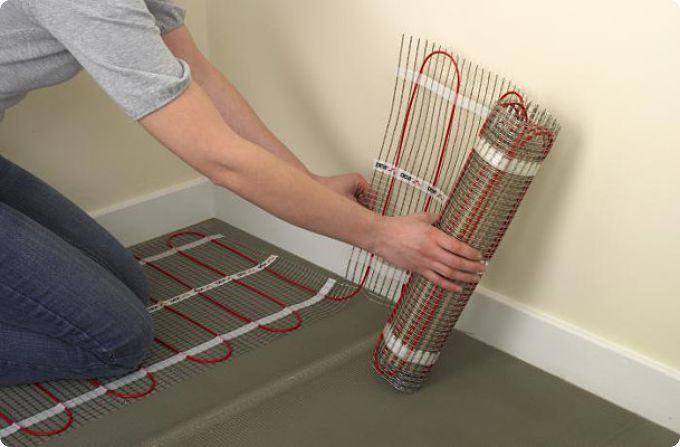 Монтажът на тънки рогозки се различава по това, че монтажната лента и замазката не са необходими: рогозките се поставят в слой изглаждащо или лепило за плочки, а подовите плочки се поставят отгоре.