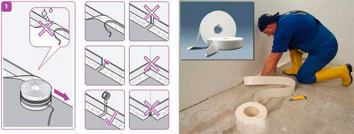 - лента, снабдена с пола. Тази част е тънка, представлява пластмасов водоустойчив филм. Такъв продукт се полага на стената, полата се намира на повърхността на пода, образувайки надеждна защита на стените от влага;