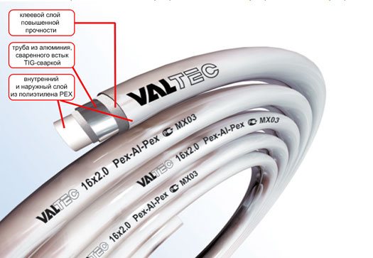 Много популярни са многослойните металопластикови тръби VALTEC. Продуктът е направен на базата на технология на омрежен полиетилен. Материалът е силно устойчив на механични повреди и има висока температурна устойчивост. Степента на хидравлично съпротивление е доста ниска. Тръбите не са обект на корозия. Електрически инертен. Животът надвишава 50 години. Цената на продукта е около 60 рубли на метър.