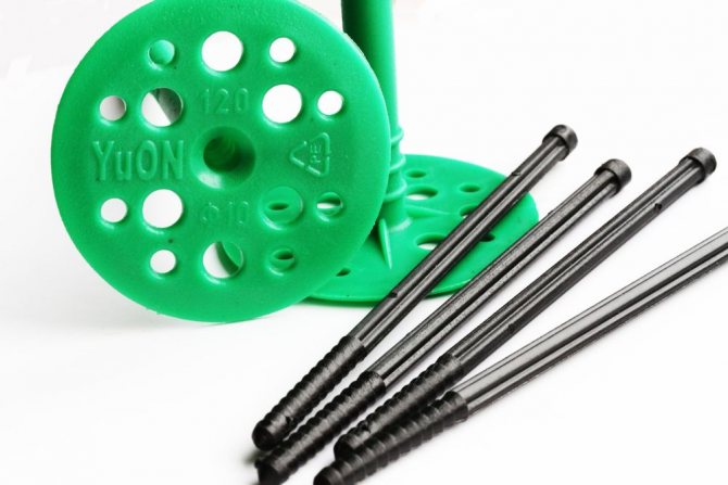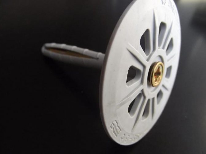 - Гъбички от пластмасови дюбели за изолация и метален прът с термична глава. Този дизайн избягва появата на студен мост. Главата на винта е покрита с найлонова капачка и нокътът е вътре.