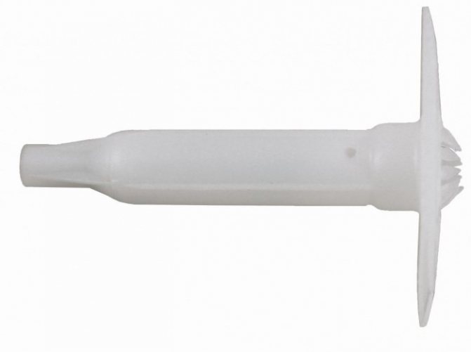 Вторият тип дюбели е куха пластмасова пръчка с широк затягащ диск. Той има специален начин на монтаж - в тялото на топлоизолатора. Гвоздеят преминава и потъва в бетон или друг плътен материал.