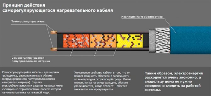 В топло поле със саморегулираща се функция кабелът прилича на обикновен изолиран двужилен проводник, в него два паралелно разположени проводника са затворени във верига. Той е оборудван с шини, които помагат за разпределението на напрежението по цялата му дължина.