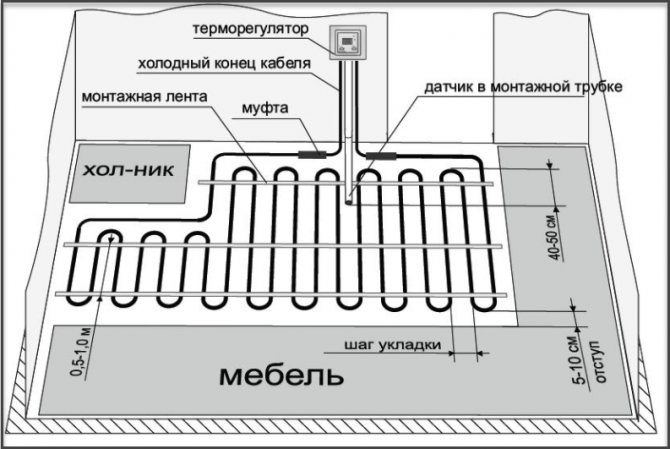 До директното разпределение на нагревателните елементи по подовата повърхност в помещението, най-добре е сами да скицирате схема, на която да маркирате зоните с мебели, избраната стъпка за полагане и други точки, които ще играят съществена роля. Тази схема ще бъде полезна в бъдеще по време на подовата настилка, за да не се повредят нагревателните елементи.