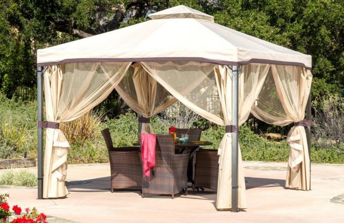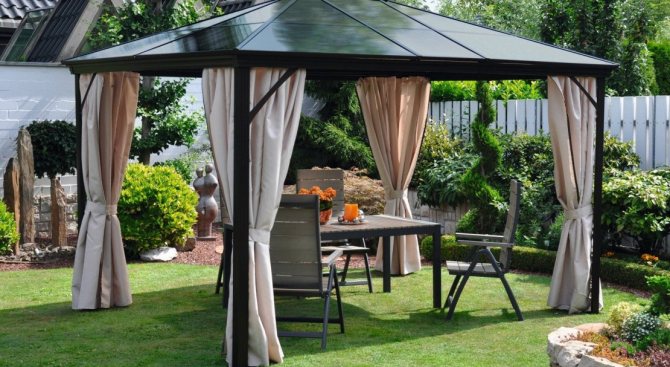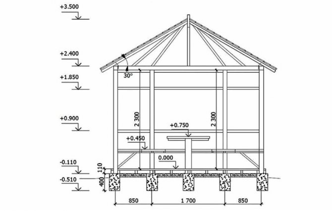 Основното предимство на беседка на фундамент е наличието на под. Добре е също така, че вътрешната повърхност на павилиона е на кота, макар и не висока, и не позволява пръски пръст да влизат в стаята по време на лошо време.
