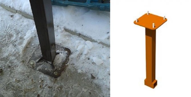 Във втория случай за монтиране на стелажи се използват специални бетонирани опорни платформи от участък от профилна тръба 100x100 mm, с квадратен лист, заварен в края. За вертикалните опори на сенника е направена чифтосваща част на "петата" с отвори за закрепване с анкерни щифтове. Този метод на закрепване ви позволява перфектно да подравните опорите при сглобяването на рамката и, ако е необходимо, да коригирате тяхното положение.Остава само да решим как да заварим навес от профилна тръба.