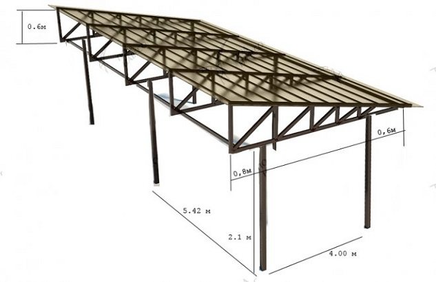 Най-често срещаният е скатен покрив, който не е труден за заваряване. Ъгълът на наклон на фермата не трябва да бъде по-малък от 8%. Ако тази стойност не се спазва, през зимата на покрива на навеса ще се събира сняг и такава козирка няма да продължи дълго.