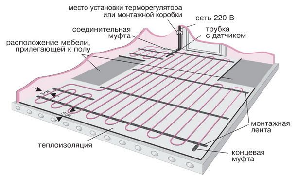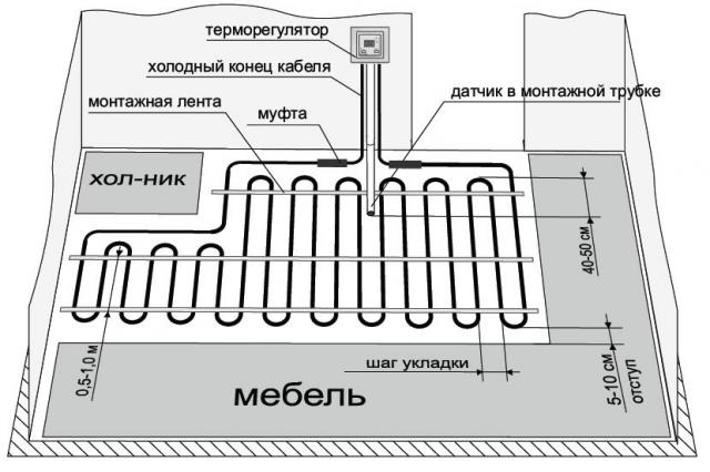 В някои случаи тя може да бъде положена под мазилка или керамични плочки, или по протежение на стената. Схемата на пода на кабела се състои от температурен сензор, към който е свързан контролния блок. Кабелът и сензорът са свързани към монтиран на стената термостат. Когато се изпрати сигнал от сензора, термостатът включва или изключва отоплителния кръг от мрежата.