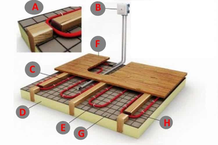 Завършвайки темата за полагане на електрически под, е необходимо да се опровергае фалшивото твърдение за невъзможността за използването му в дървена къща (или от бар). По-долу е даден пример за схема за такава инсталация.