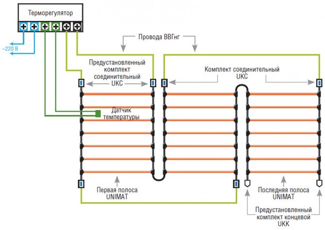 Въпреки своята простота, инсталацията има редица нюанси. Факт е, че подовото устройство предполага необходимостта от поставяне на двата края на проводника до една точка на монтаж, където цялата система е свързана към електрическата мрежа.