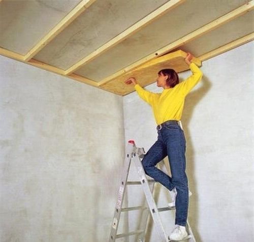 От горната част на тавана, тоест от тавана. Тук може да се използва почти всеки материал. В тази версия ще бъде удобно и практично да го направите. Можете лесно да подреждате материали плътно и да не се нуждаете от допълнително закрепване. Цялата работа може да бъде разделена на следните етапи: