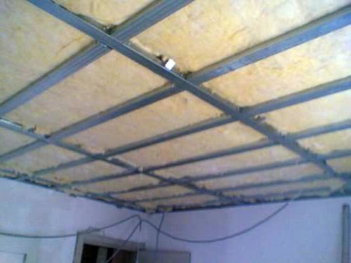- Ако гредите обикновено са тънки, тогава се прави щайга за фалшивия таван, след което материалът се монтира между профила и след това се закрепва гипсокартон;